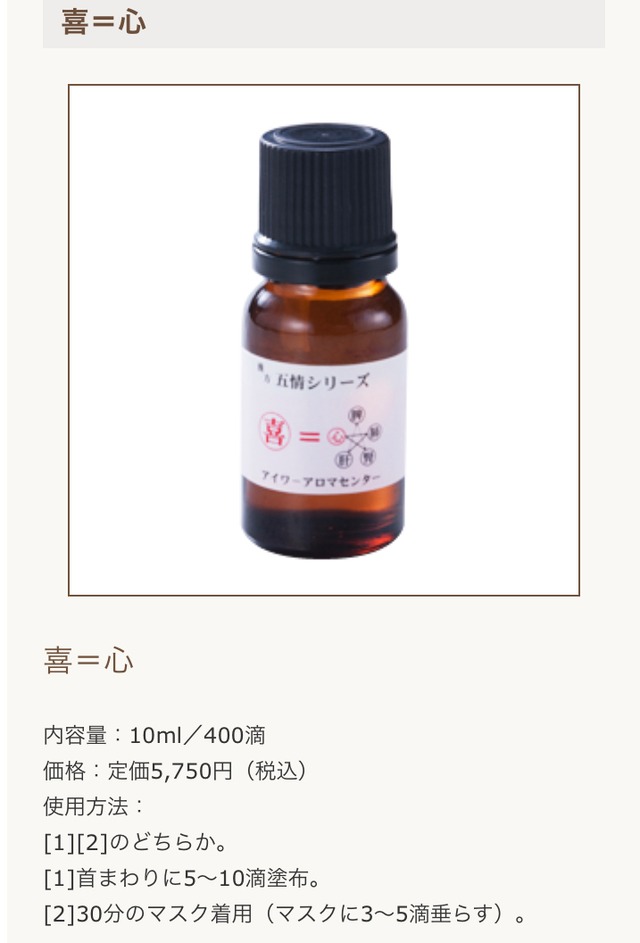 中医学では、「喜・悲・怒・思・恐」の5つの感情を五情と呼び、この感情が過度になると、気の流れが変化し、身体の不調を引き起こします。(心の感情は、身体に出ます。) 2、喜=心 (気もちが高ぶる、ドキドキする、動悸、血圧不安定、疲れやすい、不眠、心筋問題など) 容量=10ml 使用方法は、 首まわりに5〜10滴塗布、又は、マスクに3〜5滴垂らして30分吸う
