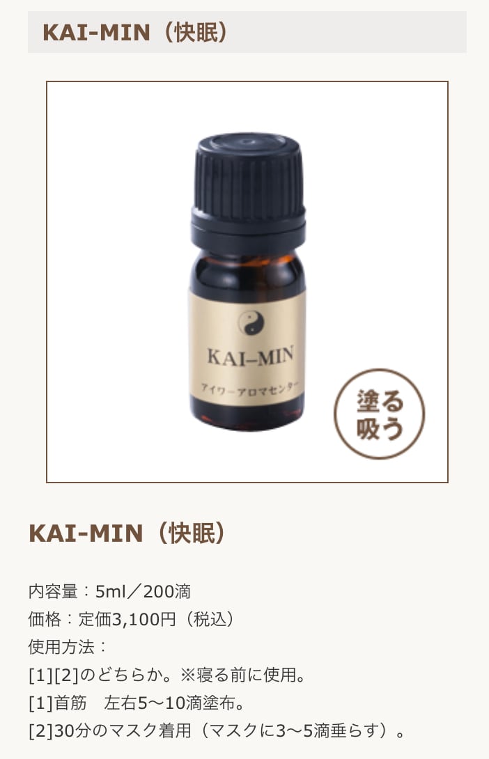 良い睡眠への第一歩「健康な体づくり」へ第一歩!!朝の目覚めが変わります。(イビキ軽減などの変化) 成分の働き ・イビキ ・自立神经の不調 ・不眠 KAI-MIN (快眠) 内容量:5ml/200滴 価格:定価3,100円(税込) 使用方法: [1][2]のどちらか。※寝る前に使用。 [1] 首筋 左右5〜10滴塗布。 [2] 30分のマスク着用(マスクに3〜5滴垂らす)